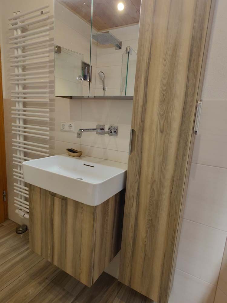 Waschtisch mit Wandarmatur, Handtuchheizkörper und Schränken